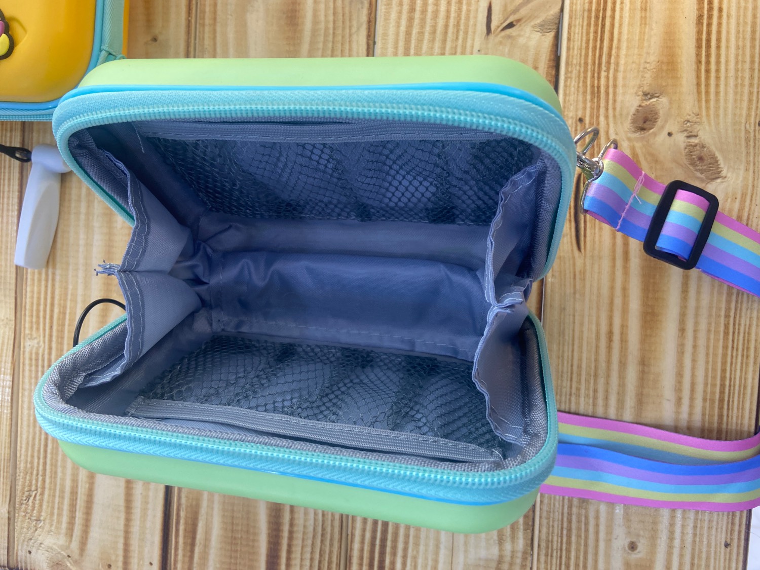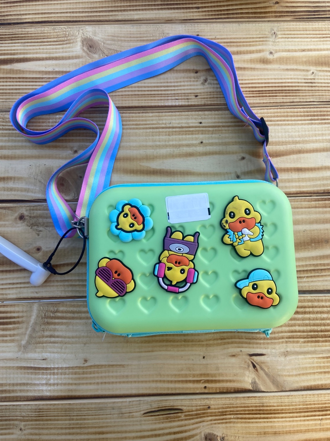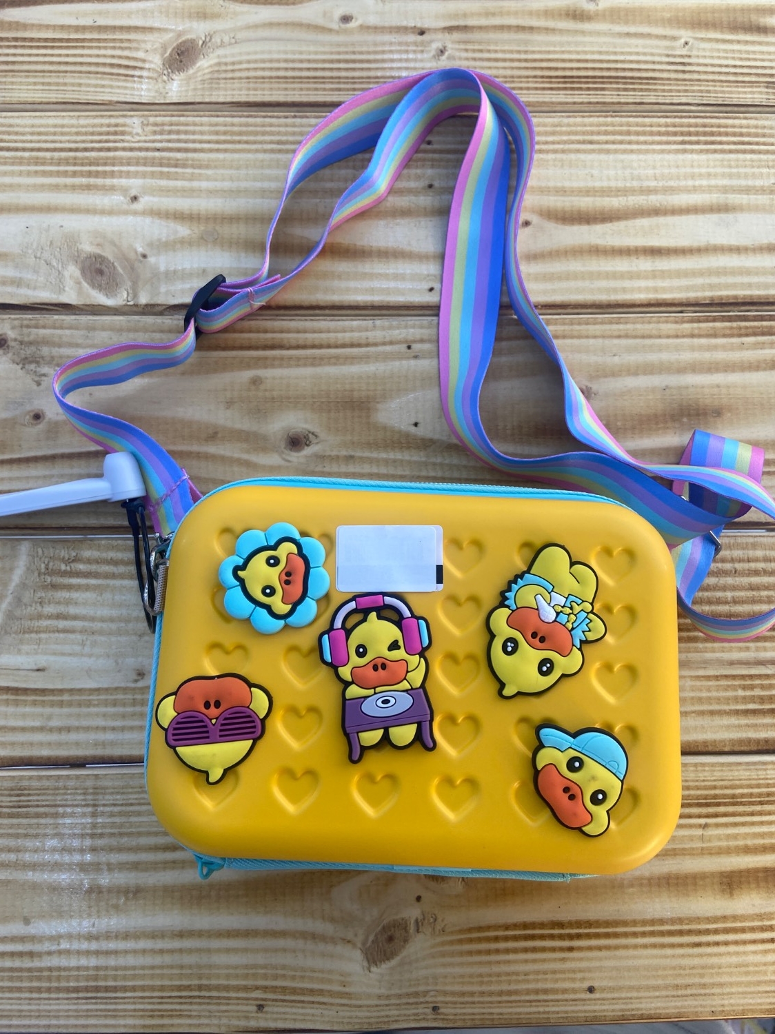 کیف وارداتی برند G-Duck ابعاد 18 در 12سانت جنس بدنه کیف محکم و نشکن و براق روی کیف استیکر کار شده دارای زیپ بند بلند قابل تنظیم طرح دار رنگبندی زرد و سبز